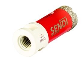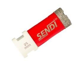 Otwornica diamentowa SENDI Ø25xM14, przeznaczona do wykonywania szybkich i precyzyjnych otworów w płytkach ceramicznych, gresowych oraz kamieniu naturalnym. Do stosowania głównie na sucho, z możliwością pracy na mokro. Diamenty, osadzone za pomocą zaawansowanej technologii lutowania próżniowego, gwarantują trwałość i efektywność narzędzia. Korpus cechuje się wykonaniem z wytrzymałej i sztywnej stali. Otwornica do płytek z gwintem M14 przeznaczona jest do pracy ze szlifierką kątową.
