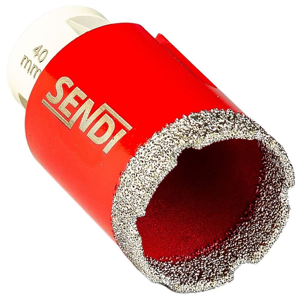 Otwornica diamentowa SENDI Ø40xM14, przeznaczona do wykonywania szybkich i precyzyjnych otworów w płytkach ceramicznych, gresowych oraz kamieniu naturalnym. Do stosowania głównie na sucho, z możliwością pracy na mokro. Diamenty, osadzone za pomocą zaawansowanej technologii lutowania próżniowego, gwarantują trwałość i efektywność narzędzia. Korpus cechuje się wykonaniem z wytrzymałej i sztywnej stali. Otwornica do płytek z gwintem M14 przeznaczona jest do pracy ze szlifierką kątową.