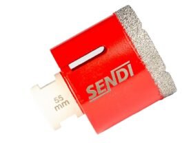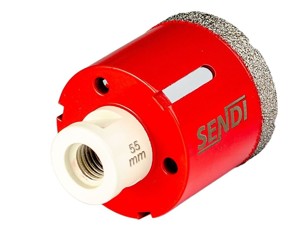 Otwornica diamentowa SENDI Ø55xM14, przeznaczona do wykonywania szybkich i precyzyjnych otworów w płytkach ceramicznych, gresowych oraz kamieniu naturalnym. Do stosowania głównie na sucho, z możliwością pracy na mokro. Diamenty, osadzone za pomocą zaawansowanej technologii lutowania próżniowego, gwarantują trwałość i efektywność narzędzia. Korpus cechuje się wykonaniem z wytrzymałej i sztywnej stali. Otwornica do płytek z gwintem M14 przeznaczona jest do pracy ze szlifierką kątową.