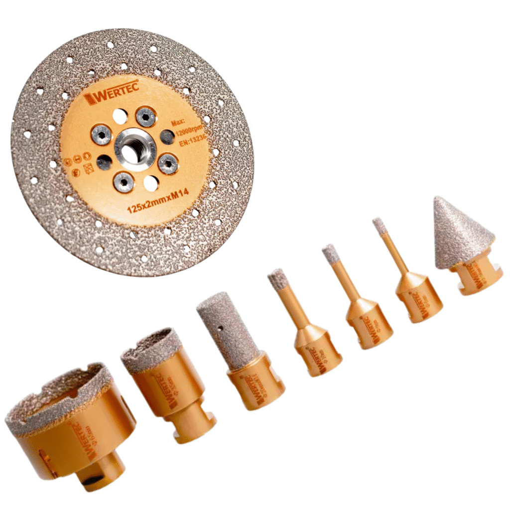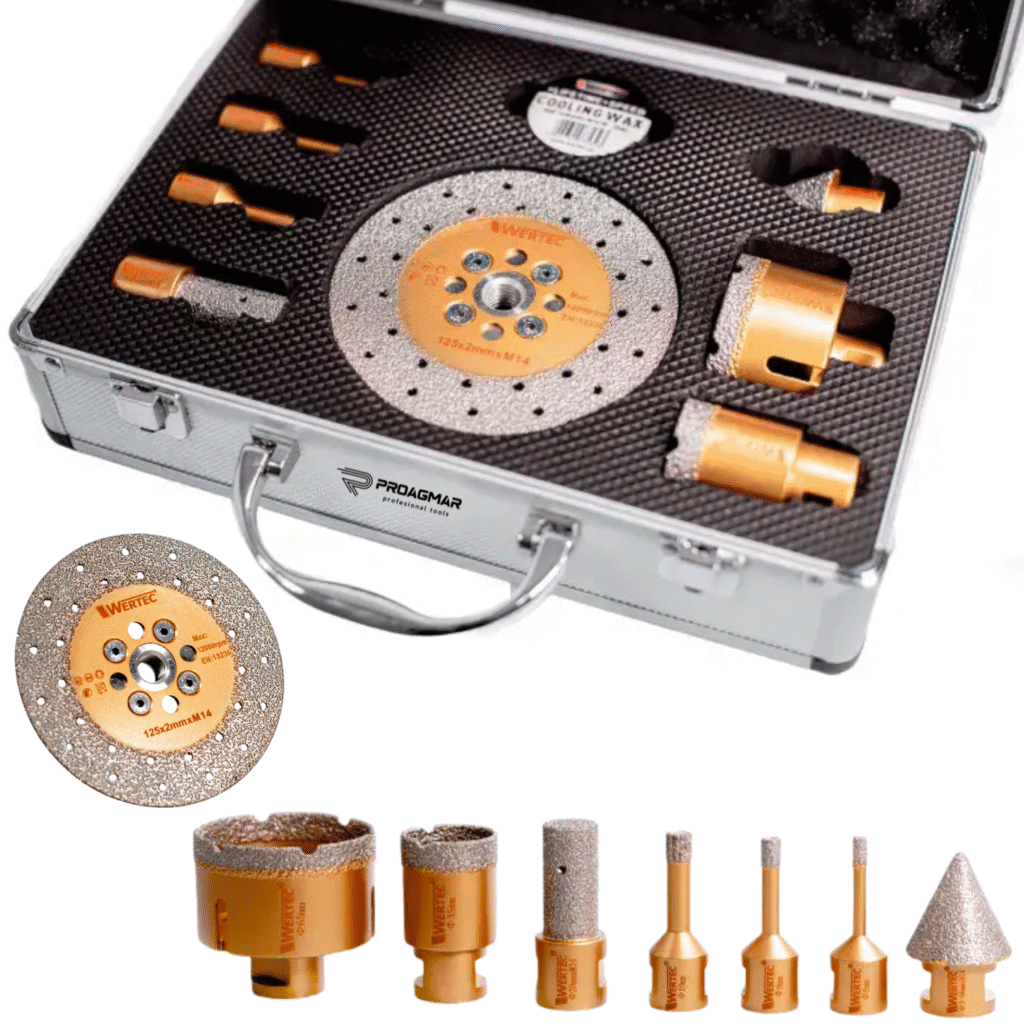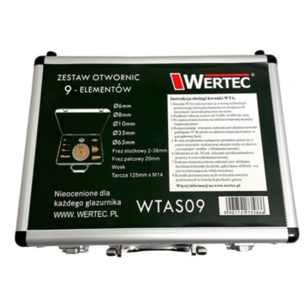 Zestaw koronek diamentowych Wertec to niezastąpione narzędzie dla glazurników, budowlańców i instalatorów, którzy potrzebują precyzyjnego i trwałego wiercenia w twardych materiałach, takich jak gres, płytki ceramiczne, porcelana, marmur i kamień naturalny.