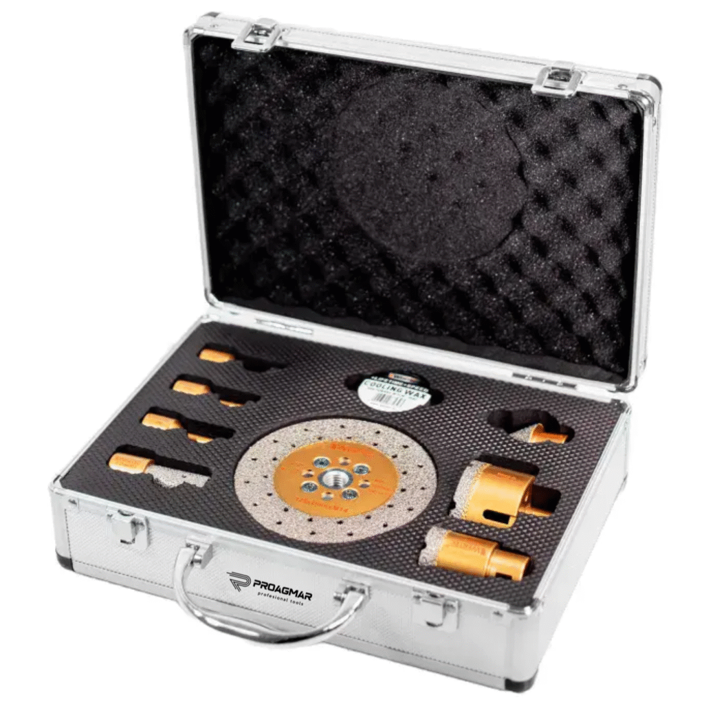 Zestaw zawiera nie tylko koronki diamentowe, ale także dwa frezy diamentowe oraz tarczę diamentową, co czyni go wszechstronnym rozwiązaniem do cięcia, szlifowania i wygładzania krawędzi otworów.