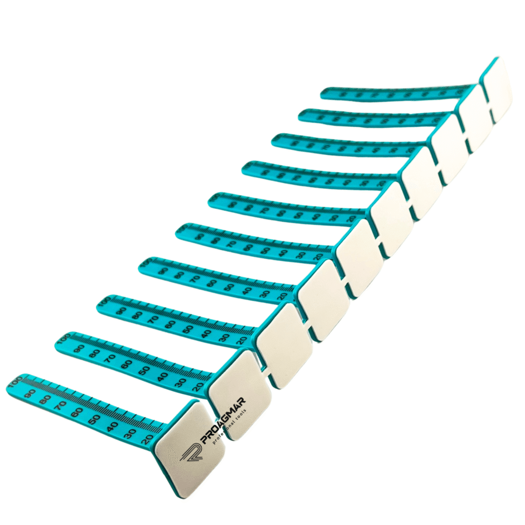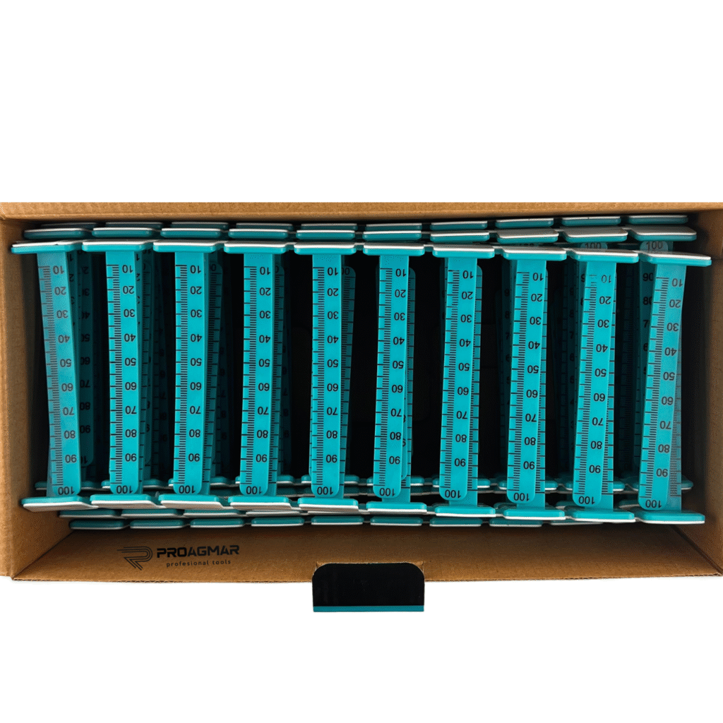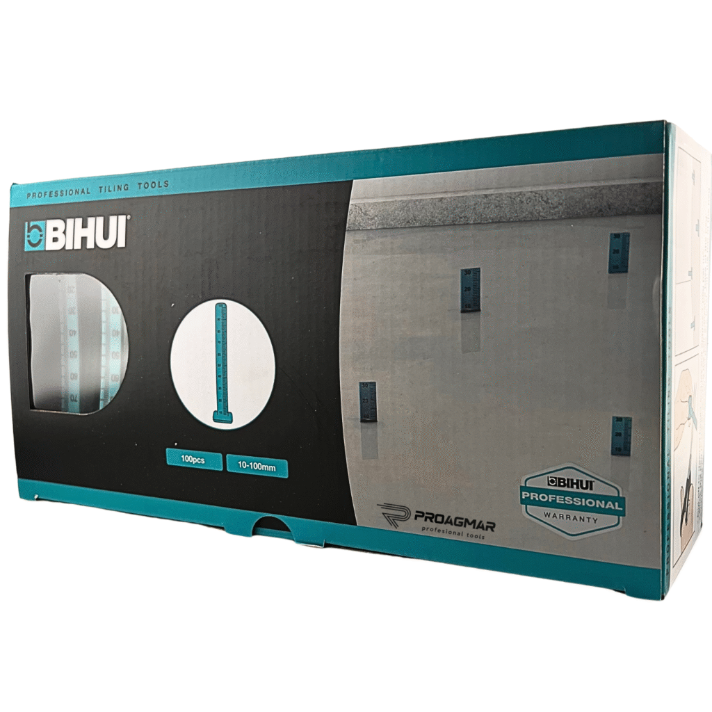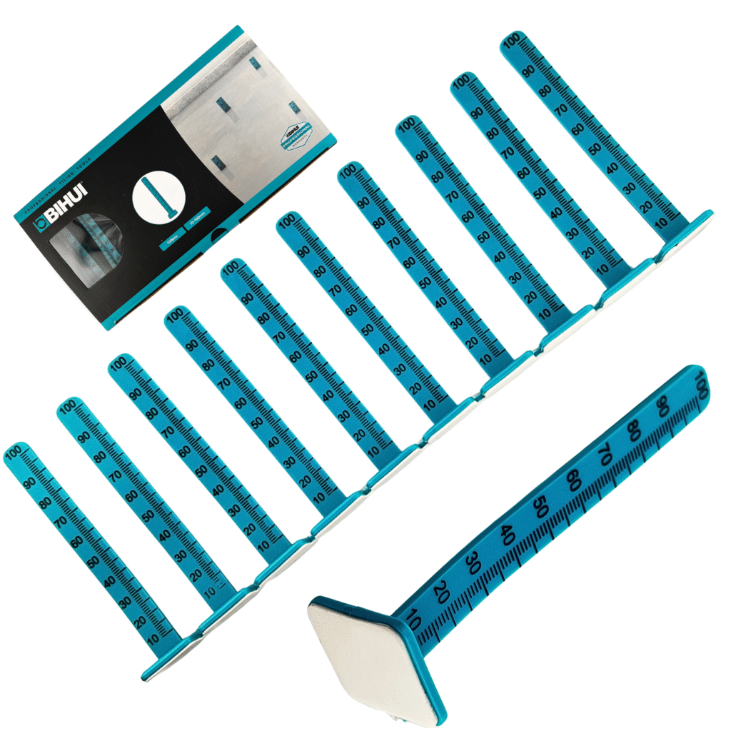 Reper niwelacyjny BIHUI MSLP100 to zestaw 100 samoprzylepnych znaczników o długości 10 cm, zaprojektowanych do precyzyjnego poziomowania podczas wylewania podłóg samopoziomujących i cementowych.