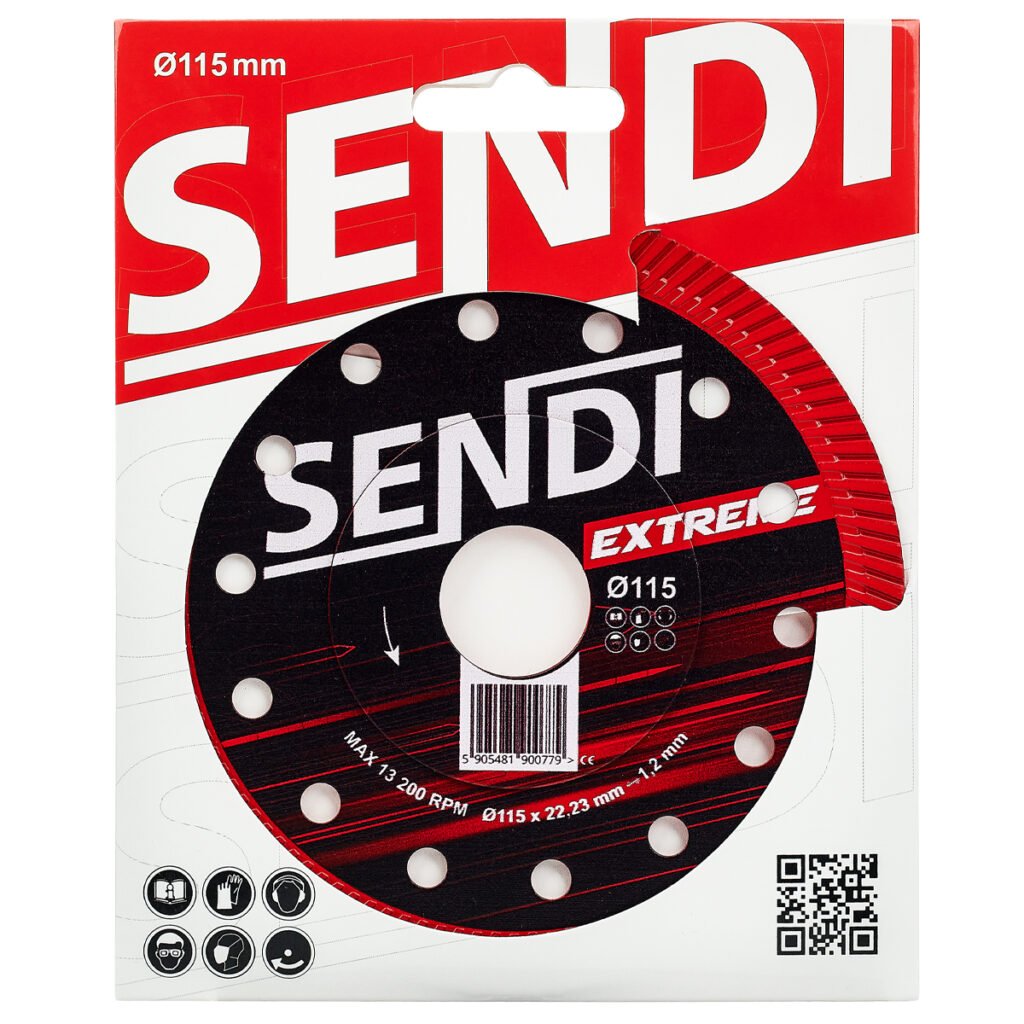 Tarcza diamentowa SENDI EXTREME o średnicy 115 mm z otworem mocującym 22,23 mm, do szybkiego i precyzyjnego cięcia płytek ceramicznych, gresowych, w tym gresu szkliwionego oraz dektonu. Przeznaczona do pracy na szlifierkach kątowych bez chłodzenia. Wyjątkowo cienki turbo segment diamentowy o grubości 1,2 mm zapewnia szybkie i czyste cięcie. Wzmocniony korpus tarczy zwiększa jej sztywność, a dodatkowe otwory zapewniają lepsze odprowadzanie ciepła.